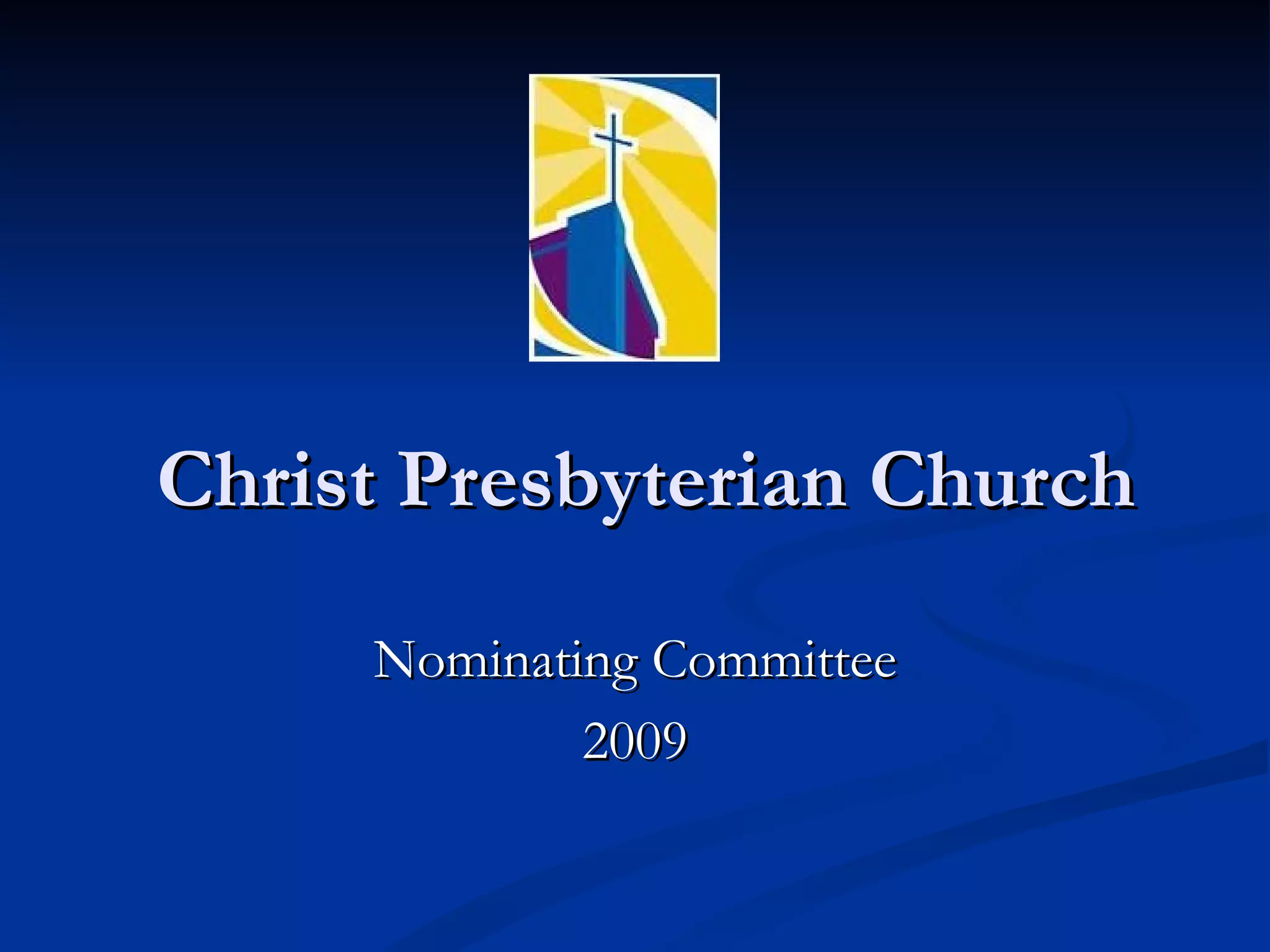The document discusses the roles and responsibilities of the nominating committee, elders, and deacons at Christ Presbyterian Church. The nominating committee is responsible for preparing a slate of officers for elder and deacon positions. Elders oversee the spiritual, educational, and practical activities of the church and encourage worship and mission. Deacons serve those in need within and outside the church community and assist with worship duties under the supervision of the session. Both elders and deacons must demonstrate strong faith, dedication, and love of Christ.