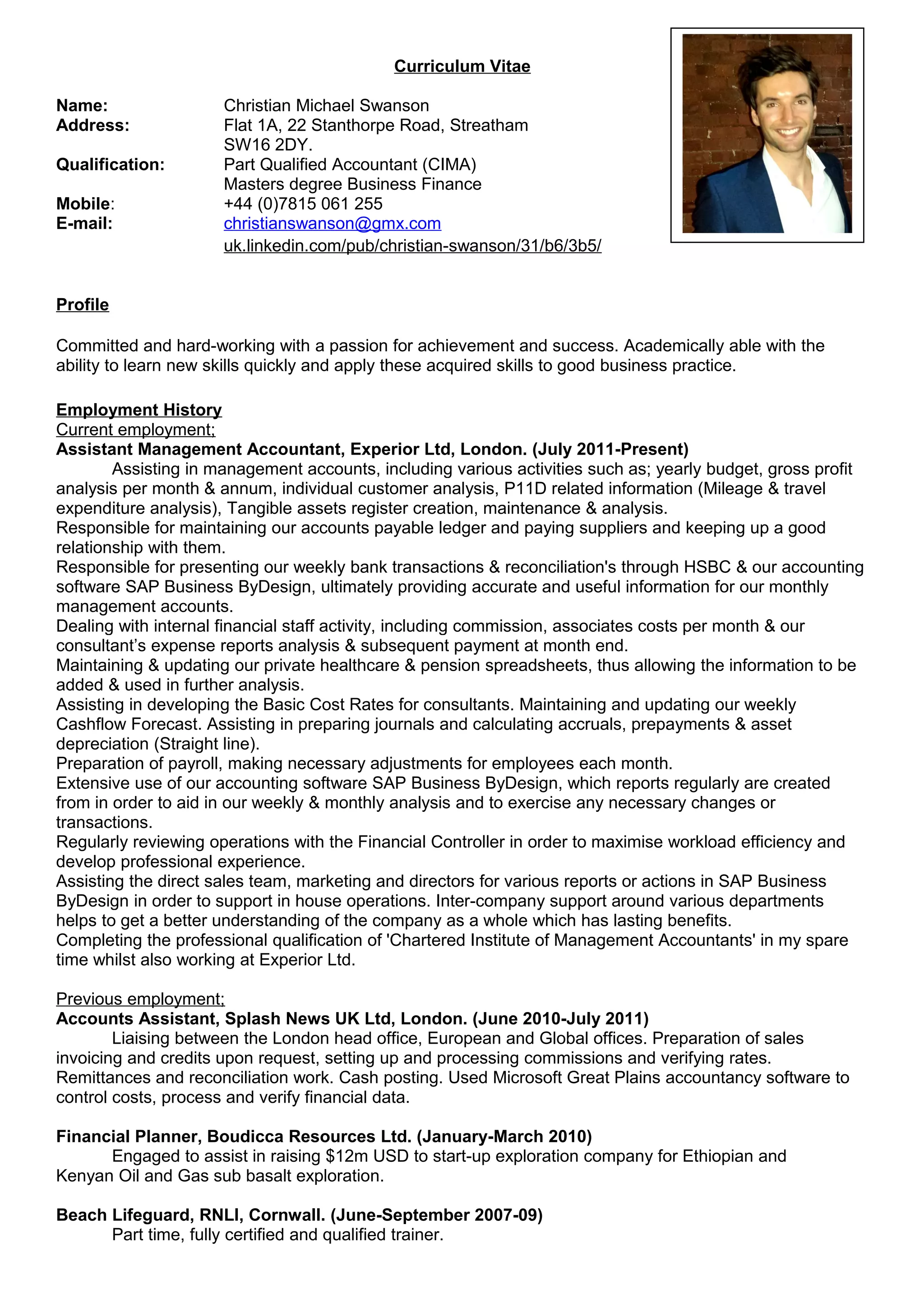 Christian Michael Swanson is seeking a position as an accountant. He has a Master's degree in Business Finance and is a Part Qualified Accountant. Currently, he works as an Assistant Management Accountant at Experior Ltd in London, where he assists with management accounts, accounts payable, bank reconciliations, and financial analysis and reporting. Previously, he held roles as an Accounts Assistant and Financial Planner. He is proficient in accounting software and Excel and has extensive professional experience in finance.