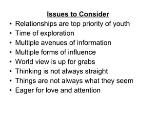 Christian youth discipleship involves building honest and trusting relationships where mentors can provide direction while also exploring life's uncertainties. Through discipleship, a youth's understanding of God, self, and grace can grow as their faith develops. Effective discipleship is a long-term commitment that acknowledges each person's individual journey and requires personal investment of time and patience to see the youth mature at their own pace.