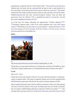 Christianity is a monotheistic religion based on the life and teachings of Jesus Christ. It believes that Jesus is the Son of God and savior of humanity. The three largest groups of Christianity are the Roman Catholic Church, Eastern Orthodox Church, and various Protestant denominations. Central Christian beliefs include the Trinity, divinity of Jesus, death and resurrection of Jesus, salvation through faith in Jesus, and that Jesus will return for the final judgment.