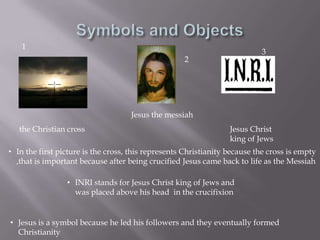 This document summarizes key aspects of Christianity including symbols, celebrations, holy places, important figures, core beliefs, rituals, and holy writings. It discusses how the cross represents Christianity as Jesus came back to life after crucifixion. It also explains that Christmas and Easter celebrate Jesus' birth and resurrection, and that churches are basic places of worship. The Bible contains Christian beliefs and consists of 66 books including the four Gospels of Matthew, Mark, Luke and John.