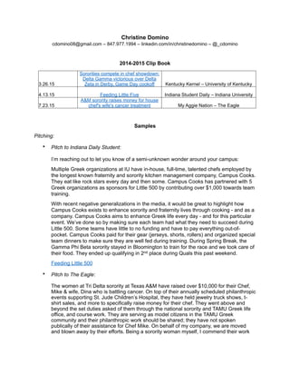 Campus Cooks is a fraternity and sorority kitchen management company that provides full-time chefs for Greek organizations. Christine Domino is a marketing and communications specialist for Campus Cooks who pitches story ideas to publications. Some of her recent pitches include a Tri Delta sorority at Texas A&M raising over $10,000 for their Campus Cooks chef's wife's cancer treatment, and a Sigma Kappa sorority at the University of Tennessee hosting a philanthropic tailgate to raise money for Alzheimer's Association. Domino also oversees Campus Cooks' social media presence, creates marketing materials like newsletters and press releases, and writes content for their blog and LinkedIn page.