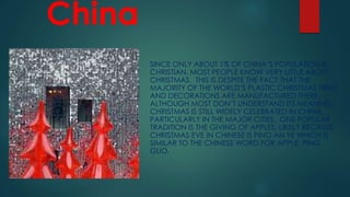 The document summarizes Christmas traditions in several countries around the world. In China, Christmas is celebrated even though most of the population is not Christian. A popular tradition is giving apples, which is related to the Chinese word for Christmas Eve. In Zimbabwe, celebrations begin with church and continue with visiting family and exchanging gifts while listening to music. Brazilian children leave socks for Papai Noel and also exchange small anonymous gifts leading up to Christmas when identities are revealed. Australians replace Santa's reindeer with kangaroos and have beach barbecues for Christmas lunch.