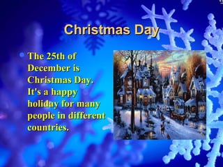 Christmas is celebrated on December 25th in Great Britain. Prior to Christmas, people send greeting cards to friends and family. Christmas trees are decorated with lights, toys and colored balls. Children put stockings by their beds hoping Father Christmas will fill them with presents overnight. On Christmas day, families gather for a meal that traditionally includes turkey, potatoes, vegetables and Christmas pudding cake.