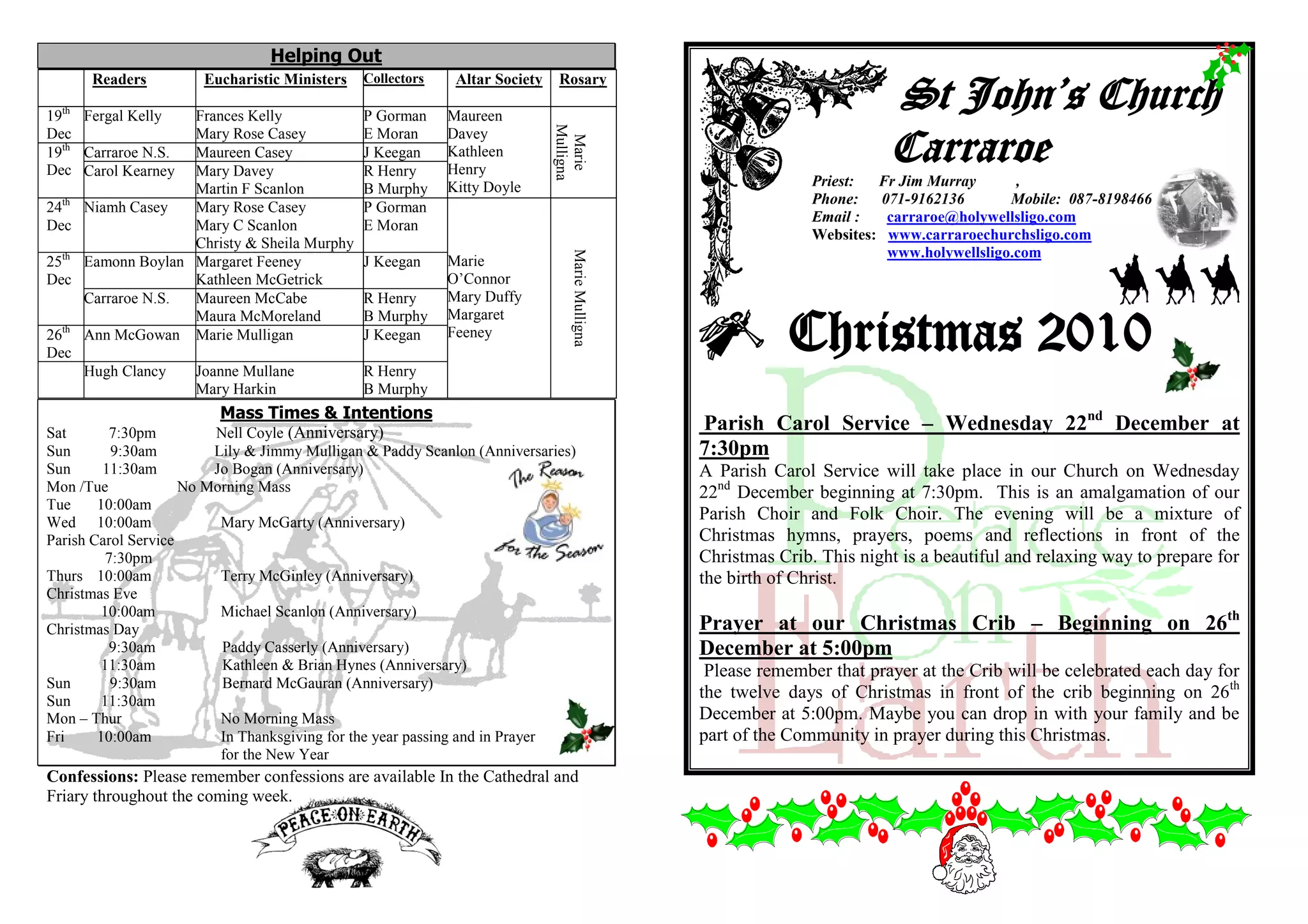 This document provides information about volunteer opportunities and events at St. John's Church in Carraroe for the Christmas season. It lists the schedules for masses and intentions from December 19th to January 1st. It also announces a parish carol service on December 22nd and daily prayers at the Christmas crib from December 26th onwards. The document expresses gratitude to volunteers and coordinators of church ministries and provides notices about new envelopes and calendars for 2011.
