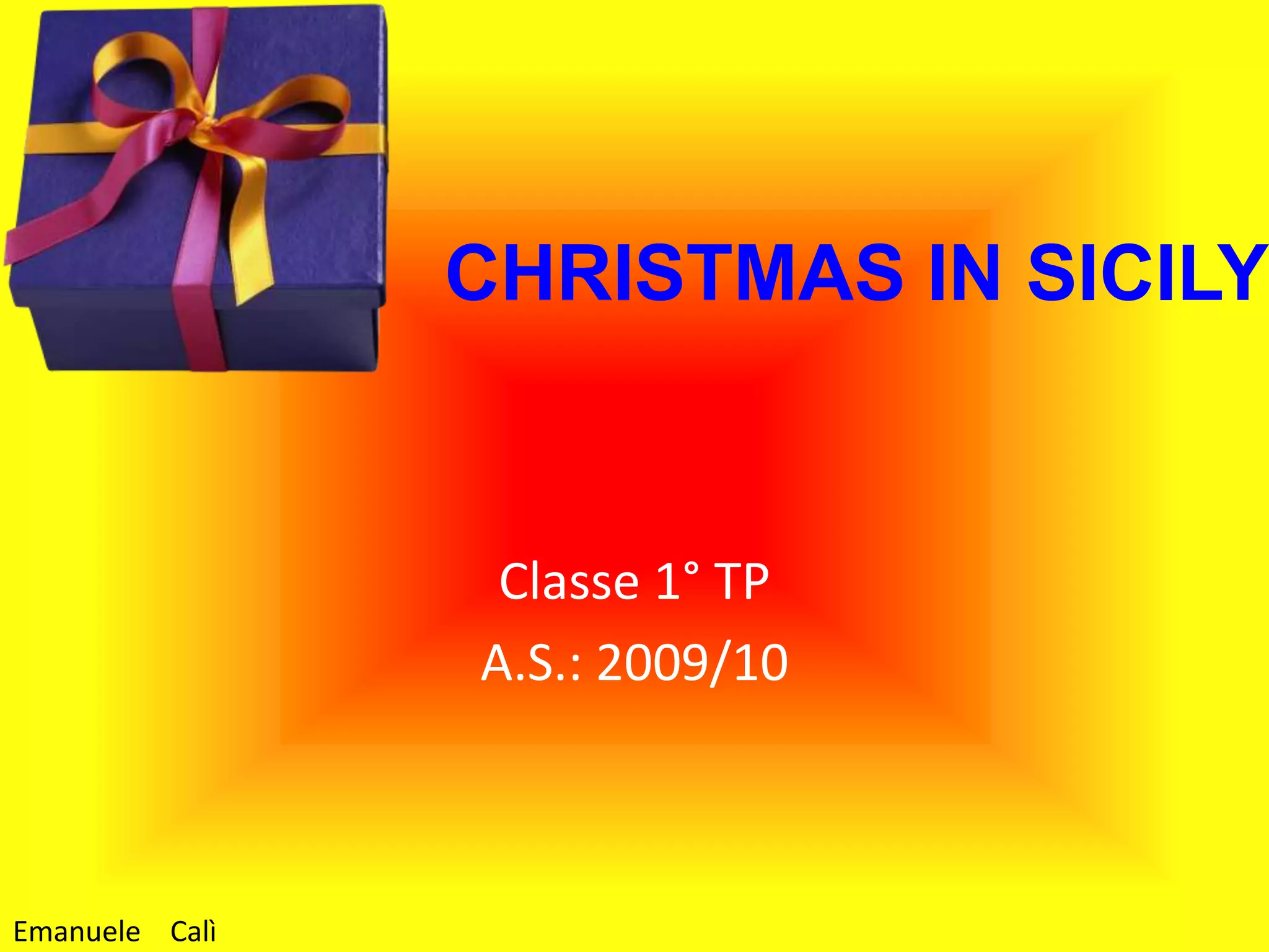 Il documento parla delle tradizioni natalizie in Sicilia, descrivendo usanze come l'allestimento del presepe e dell'albero di Natale. La notte della vigilia è dedicata a un pasto in famiglia e durante il giorno di Natale si consuma panettone con spumante. Il lavoro è stato presentato da Emanuele Calì della classe 1° TP nell'anno scolastico 2009/10.