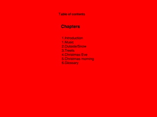 This document provides an overview of Christmas traditions through 5 short chapters. It discusses Christmas music, decorating outdoor trees, baking treats, the anticipation of Christmas Eve when Santa arrives, and the excitement of opening presents on Christmas morning. The traditions covered include listening to carolers, playing in the snow, hanging ornaments on the tree, leaving cookies and milk for Santa, and waking up to find gifts under the tree.