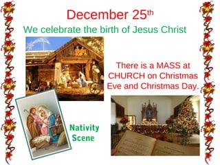 We celebrate Christmas on December 25th to commemorate the birth of Jesus Christ. There are many Christmas traditions and symbols including Christmas trees decorated with lights and ornaments, hanging stockings, exchanging gifts under the tree, and Santa Claus delivering presents on Christmas Eve. Christmas is a time for generosity, charity, spending time with family and friends, and remembering the reason for the season - the birth of Jesus Christ.