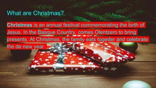 Christmas is an annual festival on December 25th that commemorates the birth of Jesus Christ. In the Basque Country of Spain, the mythical figure Olentzero brings presents on Christmas Eve to put under the tree. At Christmas, families come together to eat meals and celebrate the new year.