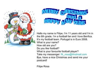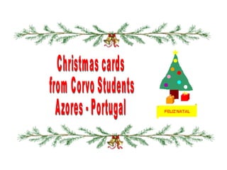 The document contains Christmas greetings from several students who live in Corvo, Portugal. The students introduce themselves, state their ages which range from 10 to 14 years old, and describe some of their hobbies and interests like football, computers, and video games. They wish the reader a Merry Christmas and Happy New Year.