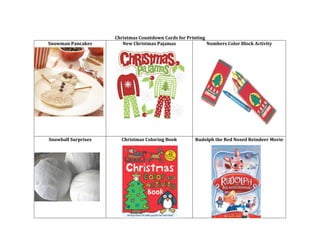 This document outlines a Christmas countdown calendar of activities for a family to do leading up to and including Christmas Day. Each day lists 1-2 activities such as making snowflakes, watching Christmas movies, celebrating a birthday party, crafts like felt trees, cookies, and outings like going to see the Christmas tree on an island. The purpose is to keep children engaged in festive activities during the holidays leading up to Christmas.