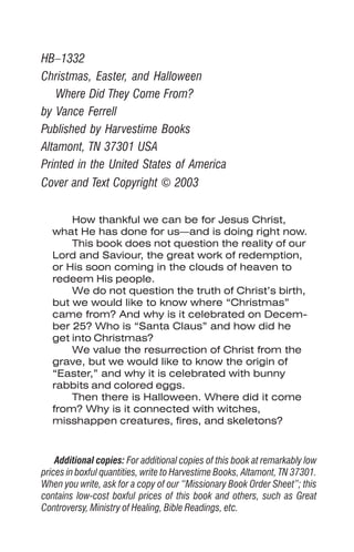 This document discusses the origins of Christmas, Easter, and Halloween traditions. It explains that Christmas was not based on the actual date of Jesus' birth, which likely took place in spring, not winter. The December 25 date was chosen by early church leaders to coincide with pre-existing pagan winter solstice festivals. Easter traditions of bunnies and eggs also derive from pagan spring festivals, not Jesus' resurrection. Halloween originated from Celtic harvest festivals incorporating pagan beliefs about spirits and the dead. The document questions why Christian traditions incorporated elements of pagan worship rather than relying solely on biblical accounts and teachings.