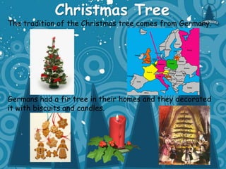 The tradition of the Christmas tree originated in Germany, where they decorated fir trees with biscuits and candles. This tradition spread to Britain after Queen Victoria's marriage to Prince Albert and became a staple of the royal family's Christmas celebrations. Today, Christmas trees are decorated with lights, tinsel, and topped with an angel or star. Towns also decorate trees in public parks and squares with lights. Famous Christmas trees include the large tree in Trafalgar Square, London given by Norway, and the Rockefeller Center tree in New York decorated with over 5 miles of lights. Charity organizations collect money and gifts for poor and homeless people during the Christmas season. Popular Christmas activities include sending greeting cards, singing carols, and attending