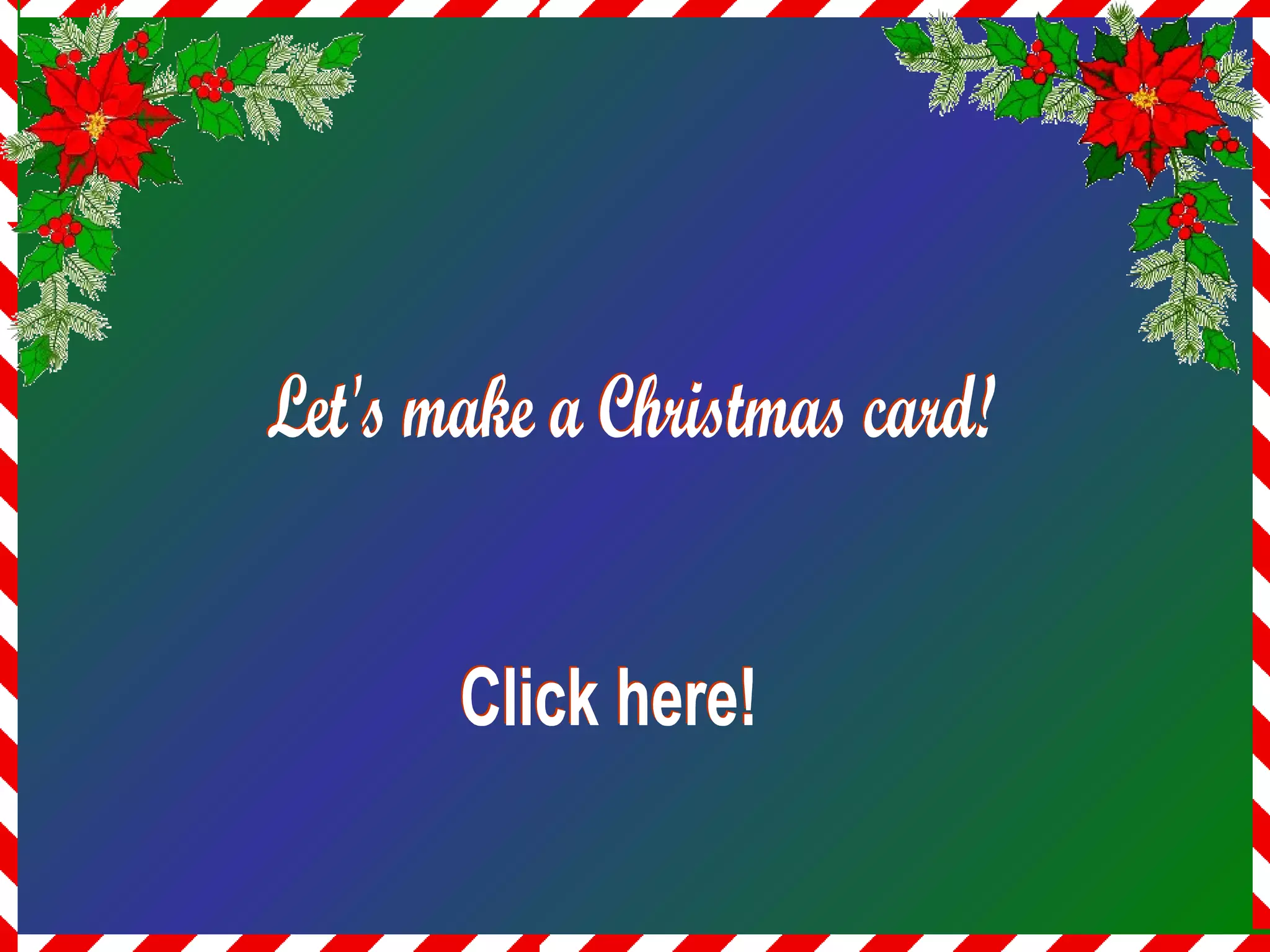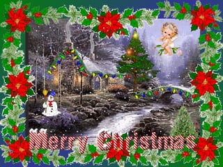 This interactive Christmas document provides instructions to click on various elements of a winter scene to add effects like lighting a pine tree, making a river run, and adding snow. Clicking areas like the chimney adds smoke, the roof illuminates the house, bringing a snowman to life, and lighting up a bridge. The final instructions are to add a Christmas greeting by clicking on the provided link to complete the virtual winter card.