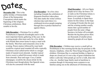 Christmas in Spain is a deeply religious holiday celebrated between December 8th and January 7th. It begins on December 8th with the Feast of the Immaculate Conception in Seville. Christmas Eve on December 24th is the most important family gathering called Nochebuena. Children receive gifts on January 6th, Three Kings' Day, when the Three Wise Men are believed to deliver presents.