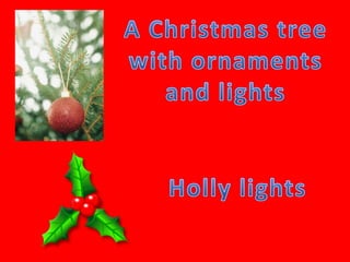 This document discusses various Christmas traditions in the UK, including celebrating on December 25th and 26th, opening advent calendars in December, spending the holiday with family, decorating Christmas trees and houses with lights and wreaths, Santa Claus visiting on Christmas Eve, opening presents and having Christmas dinner on the 25th, and family visiting on Boxing Day. Photos show decorations, the author's grandmother and house from past Christmas celebrations.