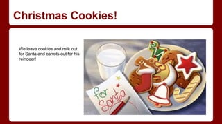 The document discusses several Christmas traditions including leaving cookies and milk for Santa and carrots for his reindeer, watching Christmas movies, some people attending midnight church services to celebrate Jesus' birthday, the tradition of kissing under mistletoe, and the folklore in the UK that robins tell Father Christmas about children's behavior.