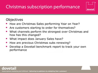 The Dovetail Christmas Performance Report indicates a 6% year-on-year decline in acquisitions with online orders up to 52% of total orders. Key insights include a growing trend for subscribers to wait for better offers, such as during Cyber Monday, and a consistent volume of direct debit orders despite falling renewal rates. The report emphasizes the importance of timing promotional offers and the need to analyze individual performance data to adapt strategies effectively.