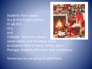 Students from several classes at Zespół Szkół - Lubzina in Poland wrote letters and Christmas cards to students in other European countries as part of an Erasmus+ project. The letters and cards were addressed to students in Finland, Turkey, Spain, Portugal, Bulgaria, Romania, Italy and Greece and were to be sent the following day. The message in the cards wished the recipients that the Christmas bells would help fulfill their dreams and wishes. It was signed by the students and teachers from Poland.