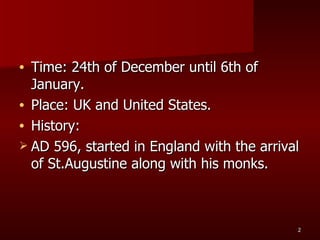 Christmas is celebrated between December 24th and January 6th in the UK and US. Some traditions include exchanging greeting cards, singing carols, wearing masks for mummers plays, and pulling Christmas crackers before meals. On Christmas Eve, Father Christmas leaves gifts in stockings, and Boxing Day on December 26th is traditionally when the poor are given gifts from Christmas boxes. Epiphany on January 6th marks the end of the Christmas season. Typical Christmas foods include roast turkey, Christmas pudding, and a mince pie each day for luck.