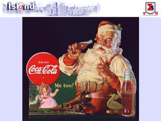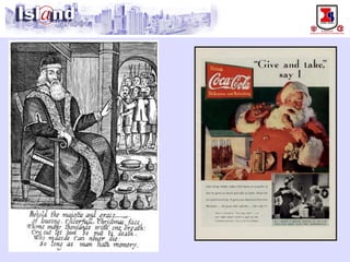 The document discusses the origins and evolution of Santa Claus from various winter solstice traditions in pagan religions to his current modern depiction. It describes how the figure of Santa Claus was derived from Saint Nicholas and influenced by pagan Germanic gods like Odin. It outlines how Santa's image as a jolly, gift-giving figure developed over time due to Christmas poems, political cartoons in the 1800s, and Coca-Cola advertising in the early 1900s which established his red suit and ties to Christmas celebrations. The document also briefly discusses historical controversies over Santa Claus and secular Christmas themes.