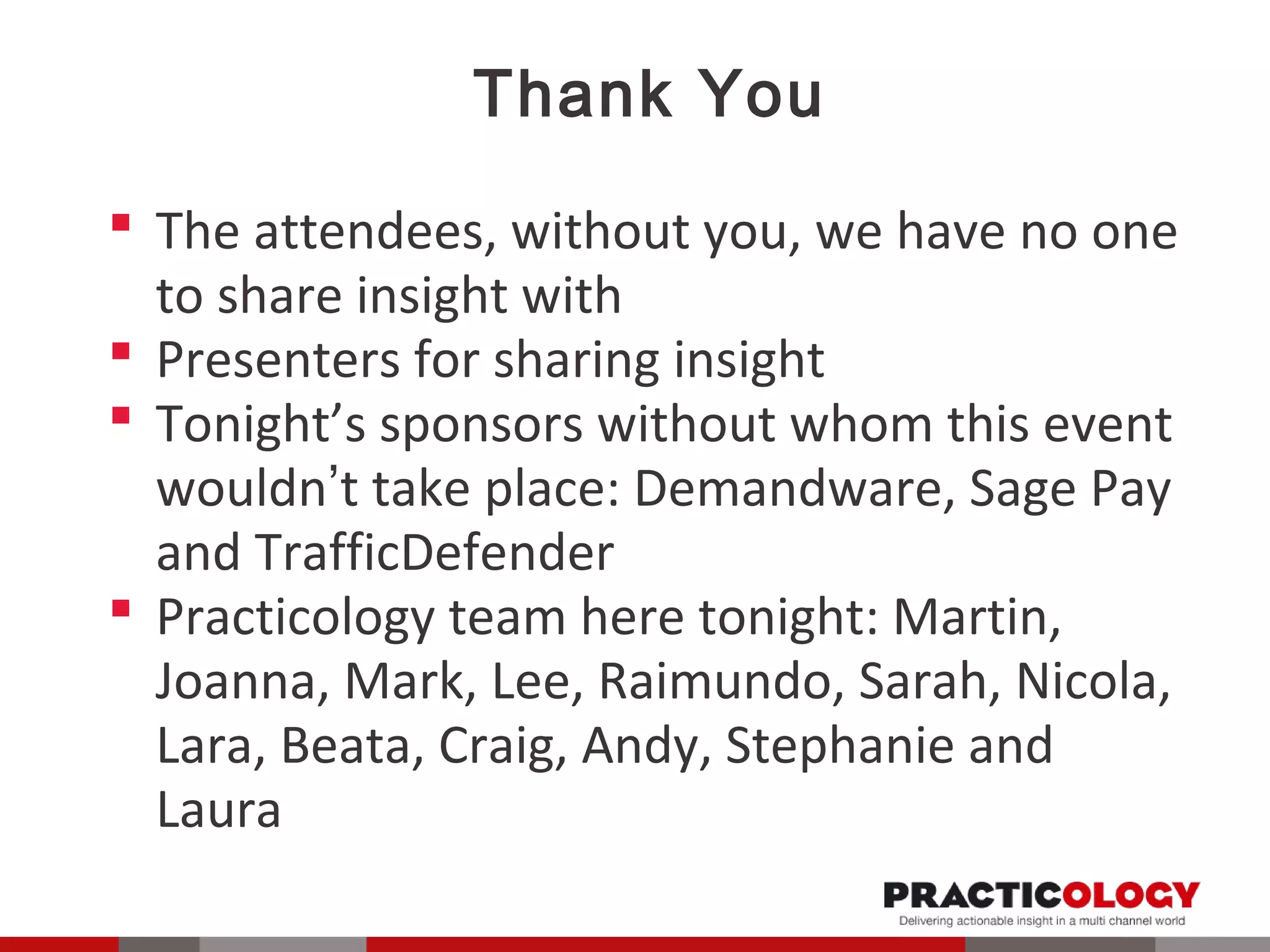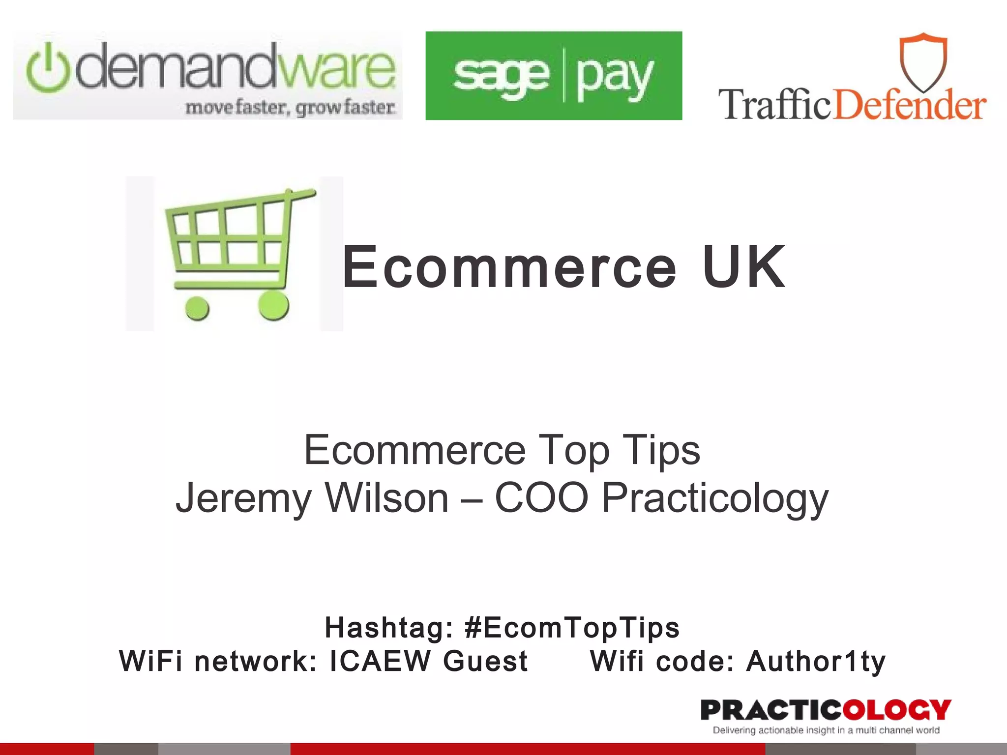 This document contains the agenda and summaries from various presentations at an Ecommerce UK event. The agenda includes presentations on ecommerce tips from representatives of companies like Practicology, La Perla, TrafficDefender, Sage Pay, Lyle & Scott, and Demandware. The summaries provide overviews of the presenters' discussions of topics like website usability, increasing online sales during peak periods, mobile optimization, and payment options.