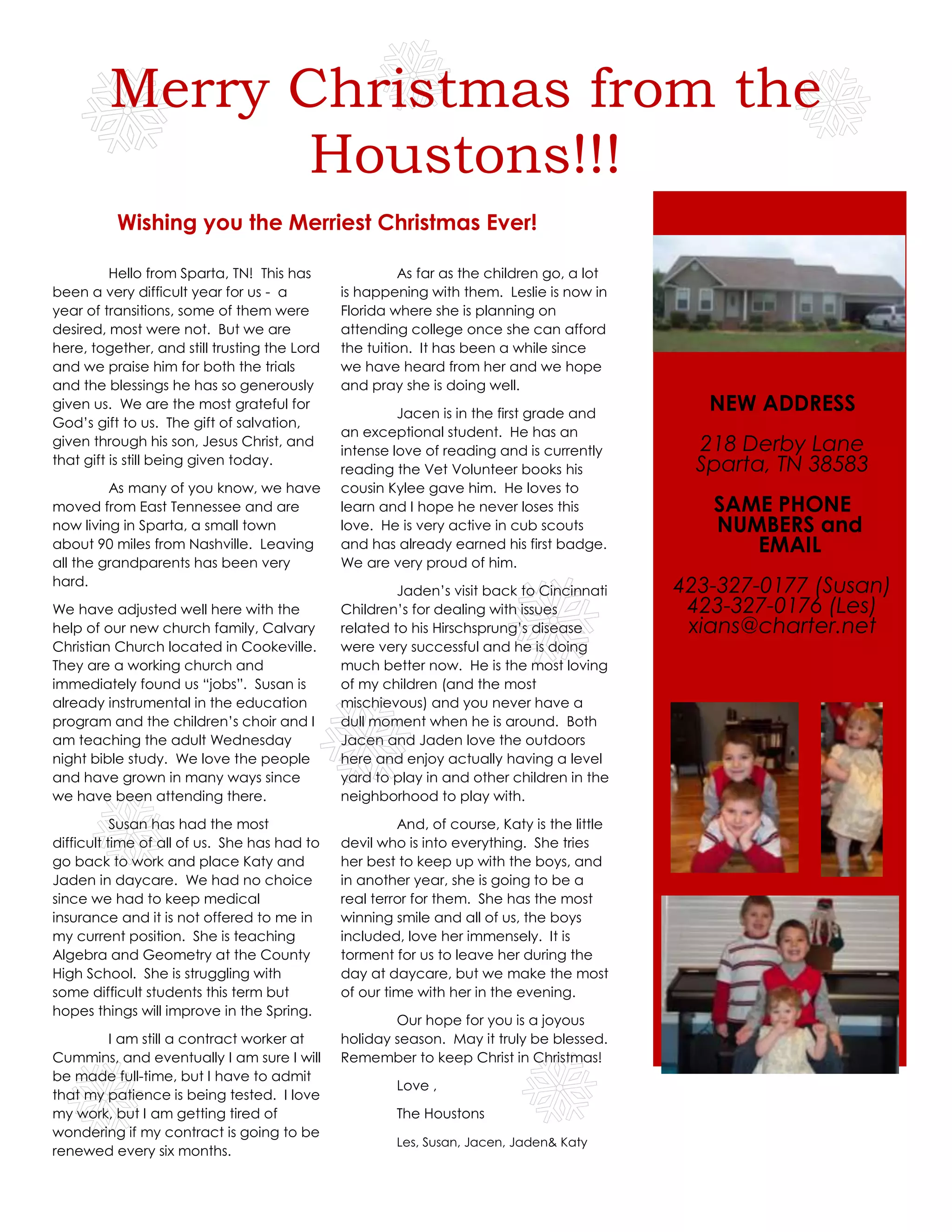 The Houston family has moved from East Tennessee to Sparta, TN after a difficult year of transitions. They have adjusted well with help from their new church. Susan is teaching and struggling with some students. Les is still a contract worker hoping to become full-time. Their daughter Leslie is in Florida and they hope to hear from her. Their son Jacen is doing well in school. Their son Jaden had a successful doctor's visit. They wish everyone a merry Christmas.