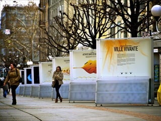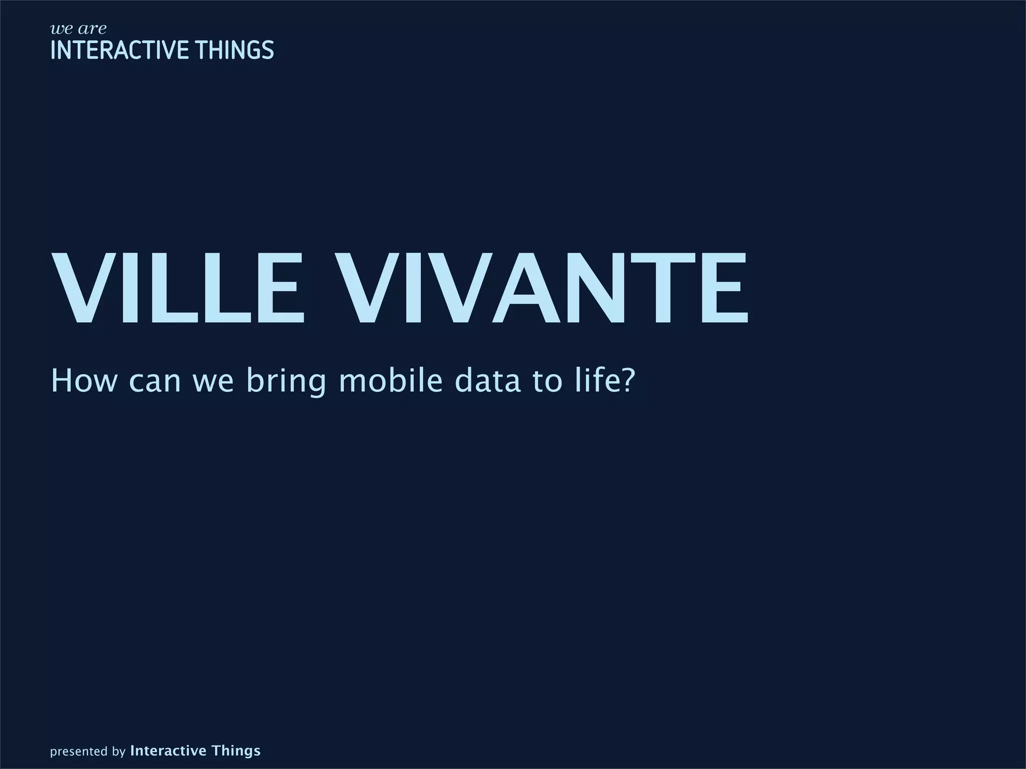 The document presents a vision by Interactive Things on how to effectively visualize and narrate anonymized mobile data provided by Swisscom. It outlines a three-step process involving understanding the data, finding personal stories, and making the information attractive through artistic representation and emotional engagement. The outcome emphasizes the importance of storytelling and visualization techniques to provide insights and capture attention.