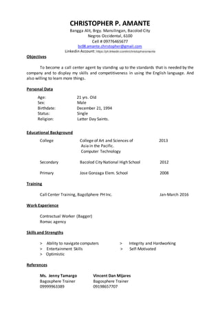 The document is a resume for Christopher P. Amante applying for a call center agent position. It summarizes his personal details, including age, marital status, religion and contact information. It also lists his educational background, training, work experience, skills and references. His objectives are to become a call center agent by meeting the company's standards and displaying his English language skills and competitiveness. He is also willing to learn more.