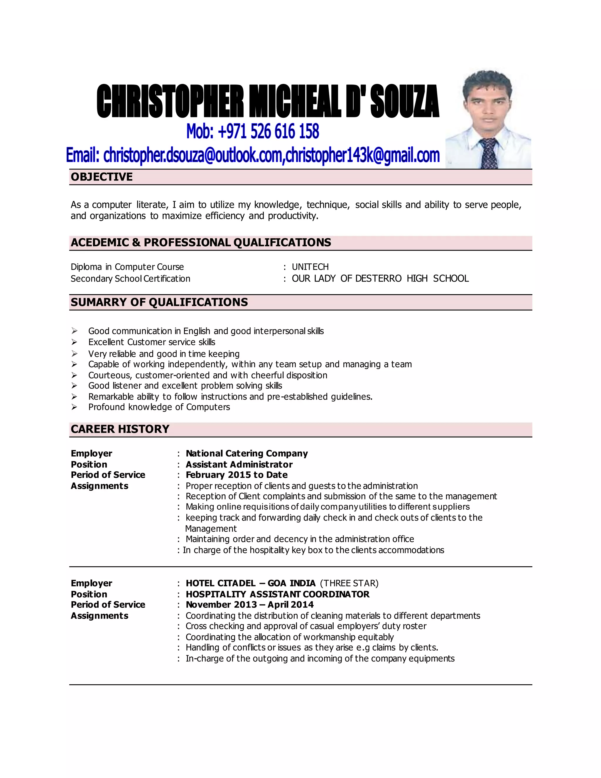 The document provides a summary of an individual's qualifications, career history, skills, and interests for a computer and administrative position. It outlines their objective to utilize computer skills and abilities to serve organizations efficiently. Academically, they have a diploma in computer studies and secondary school certification. Their career history includes positions as an assistant administrator and hospitality assistant coordinator. Key skills include strong communication, customer service, teamwork, problem solving, and computer proficiency. Personal interests include sports, travel, and billiards.