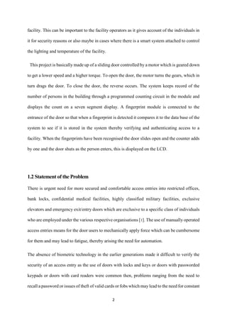 This document provides an introduction and background to a project developing an automatic sliding door with a fingerprint scanner and counting system. It discusses the need for more secure and convenient access control. The main aim is to design a device that can automatically control a sliding door using only fingerprint authentication, and keep count of the number of individuals entering and exiting through the door. It will use a fingerprint scanner, microcontroller, motor, and LCD display. The document outlines the scope, methodology, and organization of the report to describe the design, implementation, testing, and evaluation of the system.
