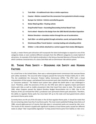 This document provides an overview of themed entertainment design and theme park rides. It discusses how theme parks appeal to vacationers by incorporating media properties into rides and attractions. It then covers common ride types and categories. Next, it discusses theme park safety standards and regulations, which are largely set by ASTM and followed voluntarily by the industry. Finally, it presents the Matterhorn Bobsleds ride at Disneyland as a case study, providing details on its design and history. The goal is to investigate current industry standards and potentially redesign an iconic ride vehicle.