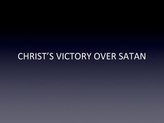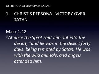 The document discusses Christ's personal and representative victory over Satan, emphasizing Jesus' temptations in the realms of the body, soul, and spirit as well as His ultimate triumph over sin, sickness, death, and demonic authority. It illustrates this victory through biblical references and the significance of Jesus' death and resurrection. Ultimately, it asserts that believers are similarly tempted yet can rely on Christ's victory in their spiritual battles.