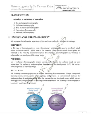 Chromatography is a technique used to separate the components of a mixture. There are several types of chromatography based on the mechanism of separation, including ion-exchange, affinity, size-exclusion, adsorption, and partition chromatography. The document provides definitions and principles of each type as well as examples of their applications in separating biochemical compounds like proteins, peptides, amino acids, and alkaloids. Chromatography is widely used in fields like biochemistry, forensic science, and environmental analysis.