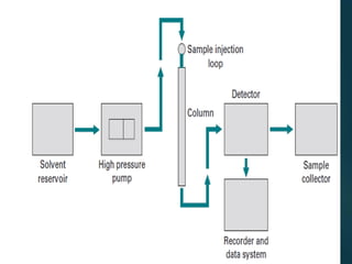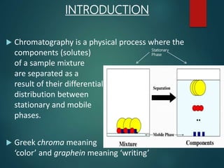 Chromatography is a technique used to separate the components of a mixture through differential partitioning between a stationary and mobile phase. There are various types of chromatography classified by the physical state of the phases used and the separation mechanism employed. The document discusses the basic principles and history of chromatography. It describes different techniques like paper chromatography, thin layer chromatography, gas chromatography, liquid chromatography and ion exchange chromatography. Applications and significance of these techniques in fields like pharmaceuticals, forensics and food analysis are also highlighted.
