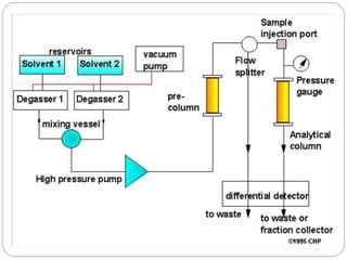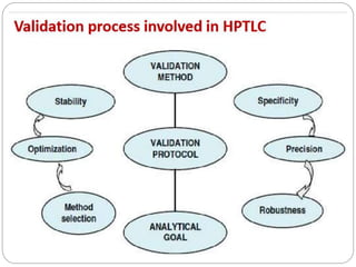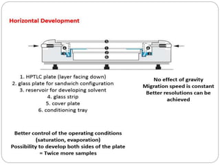 This document provides an overview of chromatography techniques. It defines chromatography as a physical separation method that distributes components between two phases, one stationary and one mobile. It then classifies chromatography based on the stationary and mobile phases used as well as the instruments involved. Several chromatography techniques are described in detail, including thin layer chromatography. The principles, components, preparation, and considerations for thin layer chromatography are explained.
