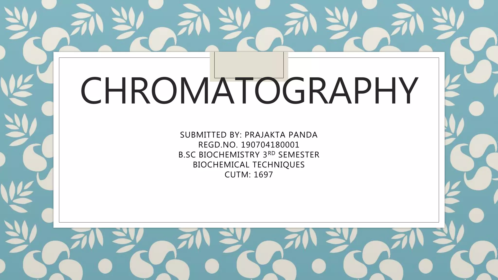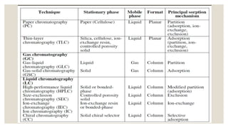 Chromatography is an analytical technique used to separate mixtures into individual components. It works by distributing components between two phases - a stationary phase and a mobile phase. There are several types of chromatography that differ based on the stationary and mobile phases used, including column chromatography, ion-exchange chromatography, gas chromatography, and high-pressure liquid chromatography. Chromatography has many applications in fields like pharmaceuticals, chemicals, food testing, forensics, and molecular biology to analyze samples, detect unknown compounds, and determine purity.