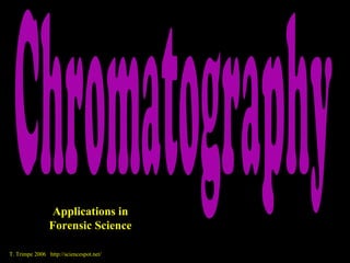 Chromatography is a technique used to separate mixtures into individual components. It works by passing a mixture through a stationary phase that separates out the different molecules. There are several types of chromatography including liquid chromatography, thin-layer chromatography, gas chromatography, and paper chromatography. Chromatography can be used in forensic science to analyze inks, dyes, drugs, and other chemical substances. It allows unknown samples to be identified by comparing how their components separate to known standards. Hands-on student experiments are described using paper chromatography to separate markers and identify mystery ink samples.