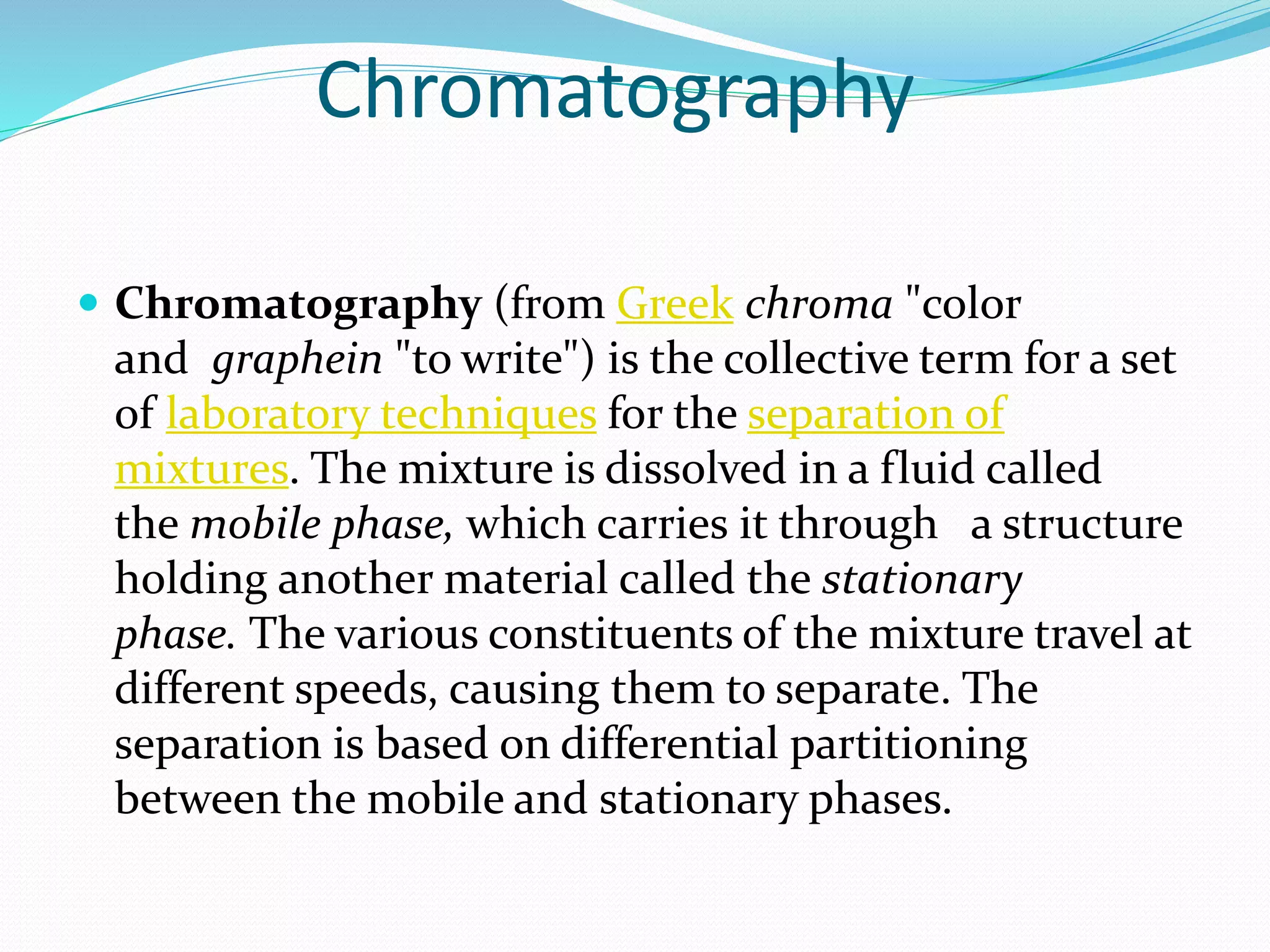 Chromatography is a technique used to separate mixtures based on how their components interact with both a mobile and stationary phase. It was first developed in 1900 by Russian scientist Mikhail Tsvet to separate plant pigments. There are several types of chromatography that differ based on the phases used, including paper chromatography, thin layer chromatography, gas chromatography, ion exchange chromatography, gel filtration chromatography, and affinity chromatography. High performance liquid chromatography is a modern technique that uses small particle sizes and high pressure to improve separation efficiency.