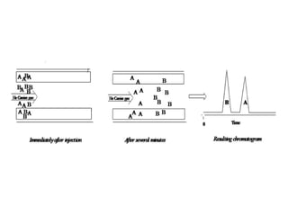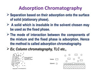 The document provides an overview of several chromatographic techniques used in analytical chemistry, including adsorption chromatography, partition chromatography, thin-layer chromatography, paper chromatography, ion exchange chromatography, and gas chromatography. It details the principles, mechanisms, and procedures involved in each technique, emphasizing the importance of retention factors (Rf) and the types of stationary and mobile phases used. Additionally, it discusses the components of a gas chromatography system and various types of detectors employed in the analysis.