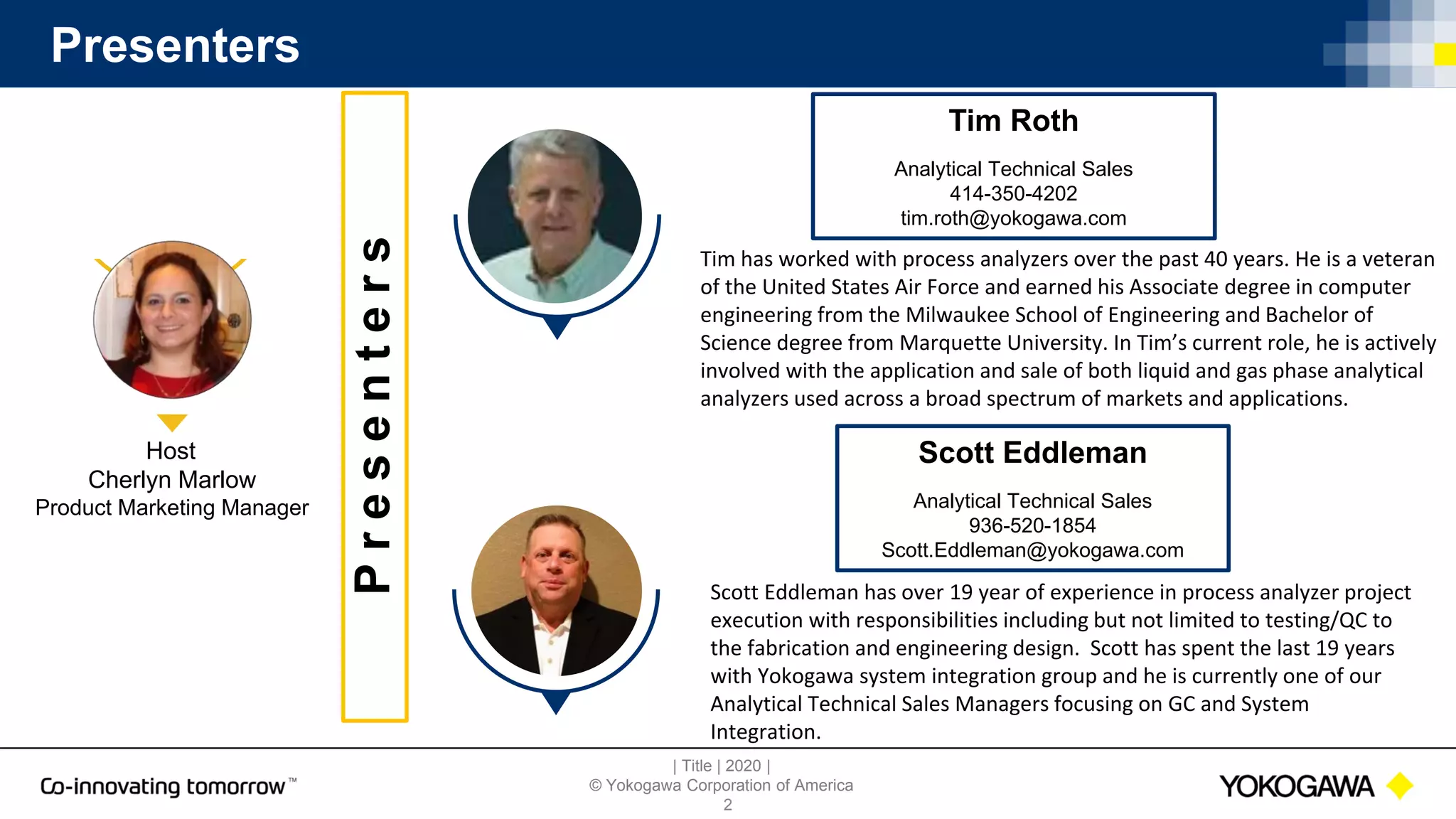 The document outlines a webinar on gas chromatography, highlighting the expertise of the presenters Tim Roth and Scott Eddleman. It covers fundamental principles of gas chromatography, various components such as sample injection valves, separation columns, and detectors, as well as techniques for analysis and sample conditioning. Additionally, it details the importance of sample extraction, system design, and the offerings of Yokogawa in analytical solutions.