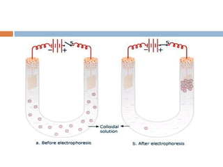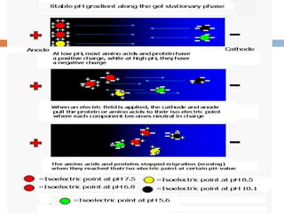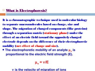 This document provides an overview of electrophoresis techniques. It defines electrophoresis as a method used to separate macromolecules like proteins based on their charge, size, and shape under the influence of an electric field. There are two main types - moving boundary electrophoresis where components separate in solution, and zone electrophoresis where separation occurs on a supporting medium like a gel or paper. Key factors that affect electrophoretic mobility and separation include the electric field strength, characteristics of the sample, properties of the supporting medium, and buffer composition and pH. Common electrophoresis methods include isoelectric focusing, high-voltage electrophoresis, capillary electrophoresis, and continuous versus discontinuous gel systems.