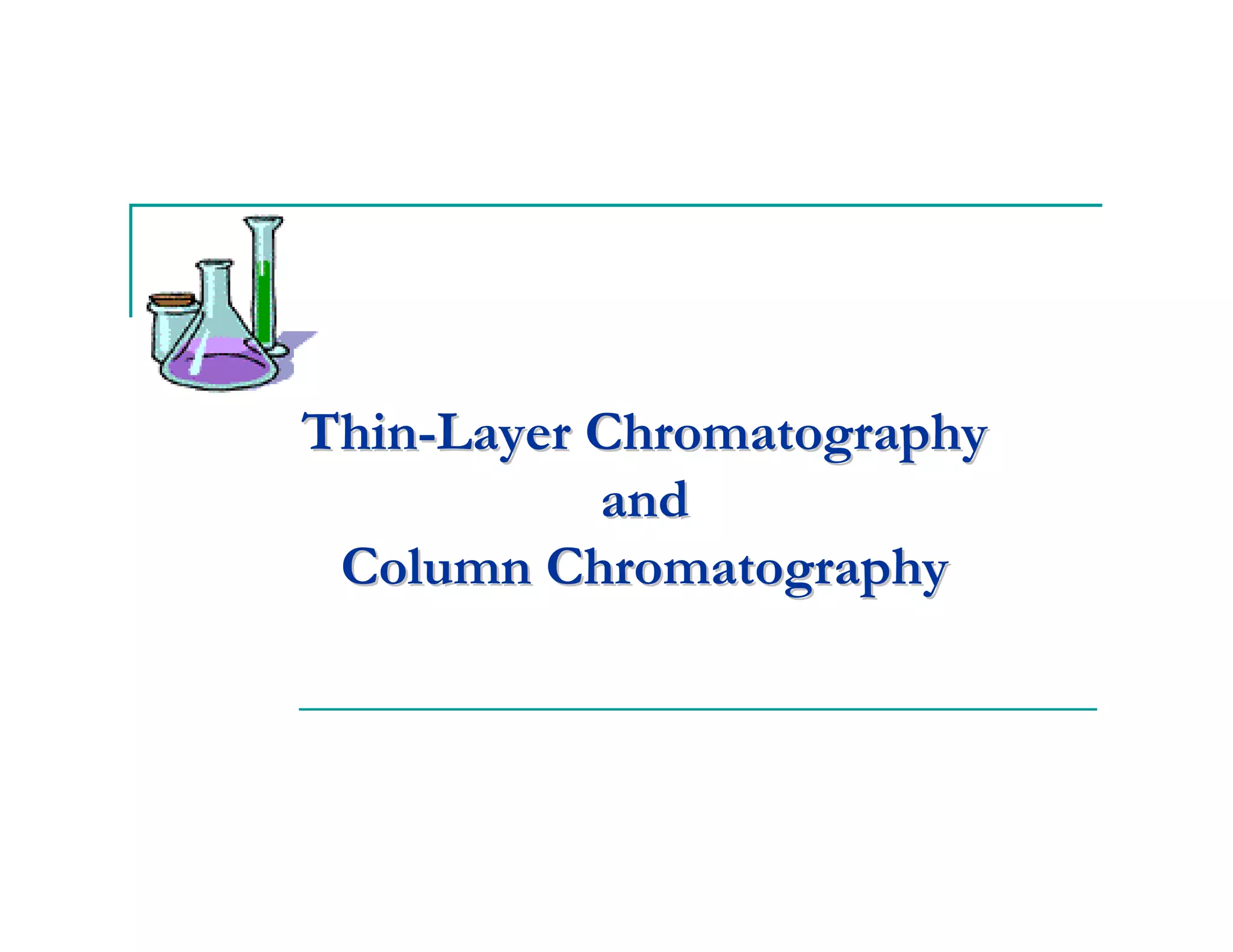 This document provides background information on thin-layer chromatography (TLC) and column chromatography. It describes the basic two-part operation involving a mobile phase that carries samples through a stationary phase. The document discusses factors that influence separation, such as choosing adsorbents and eluents. It then describes how to perform TLC and column chromatography experiments, including preparing plates/columns, developing separations, and analyzing results. Procedures are outlined for identifying unknown compounds and disposing of waste.