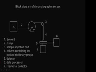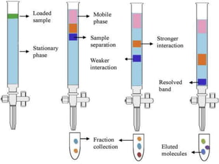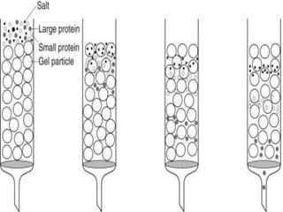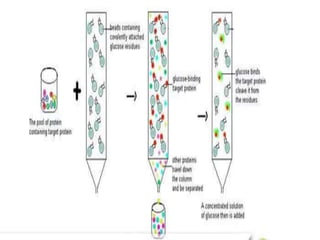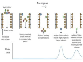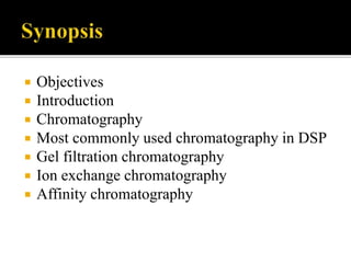 This document discusses downstream processing and chromatography techniques used in downstream processing. It begins by stating that downstream processing, which can account for up to 60% of production costs, is needed to separate and purify desired products after fermentation or enzyme reactions. Chromatography is commonly used for purification and separation in downstream processing. The document then describes the main types of chromatography used - gel filtration chromatography, ion exchange chromatography, and affinity chromatography - and explains the principles behind each technique. It provides examples of their industrial applications and summarizes the key objectives of learning about chromatography in downstream processing.