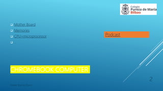 The document discusses the components of a Chromebook computer, including the motherboard, memories, CPU, and CPU being an Intel Celeron Processor N5100 with 4M Cache that can operate up to 2.80 GHz. It provides information on each component in separate slides.