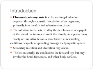 Chromoblastomycosis is a chronic fungal infection caused by several soil fungi that are acquired through traumatic skin inoculation. It is characterized by the development of warty or tumor-like skin lesions, usually on the legs or feet, that resemble cauliflower. Diagnosis involves microscopic identification of sclerotic bodies in skin scrapings or biopsy specimens. Treatment can include antifungal drugs like itraconazole or terbinafine for 6-18 months, sometimes combined with surgery, cryotherapy or heat therapy. The infection is difficult to treat and cure rates are variable.