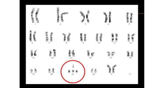This document summarizes several chromosomal abnormalities including Trisomy 13, 18, and 21 as well as disorders of sex chromosomes. Trisomy 13 (Patau syndrome) involves an extra chromosome 13 and has a high mortality rate in the first year with developmental delays and physical defects. Trisomy 18 (Edwards syndrome) also has a high infant mortality rate and involves physical abnormalities. Trisomy 21 (Down syndrome) has an incidence of 1 in 700 births and causes developmental delays. Disorders of sex chromosomes include Turner syndrome, which affects females missing an X chromosome, and Klinefelter syndrome, which affects males with an extra X chromosome.