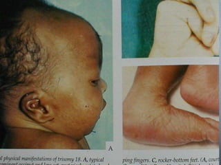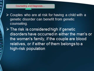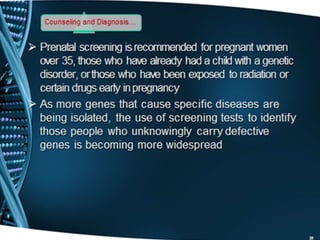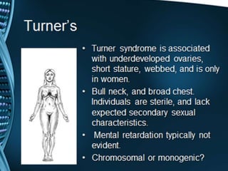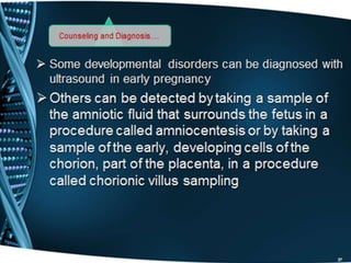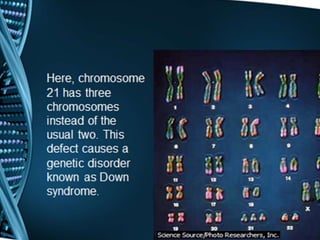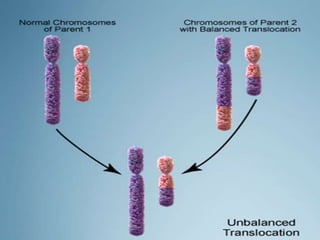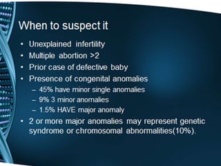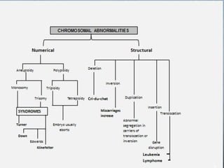 The document discusses chromosomal anomalies, including types such as numerical (aneuploidy) and structural (deletions, duplications, translocations, inversions). Examples of disorders associated with these abnormalities, like Down syndrome and Turner syndrome, are provided alongside mechanisms for how these anomalies occur during cell division. Factors that may influence the occurrence of chromosomal abnormalities, including maternal age and potential environmental effects, are also mentioned.