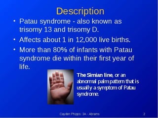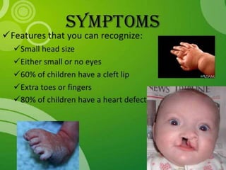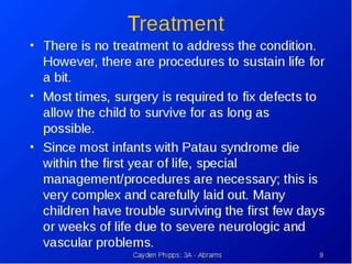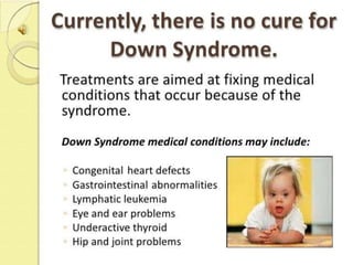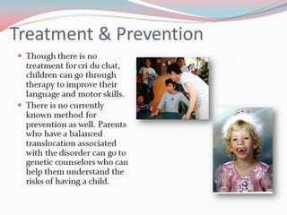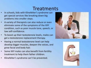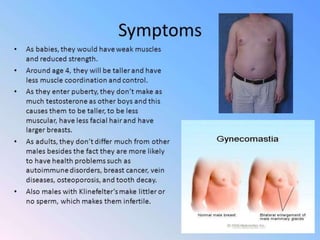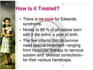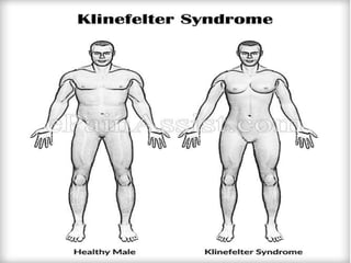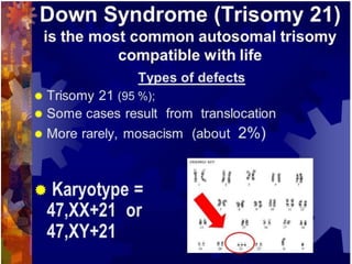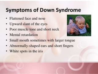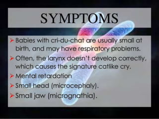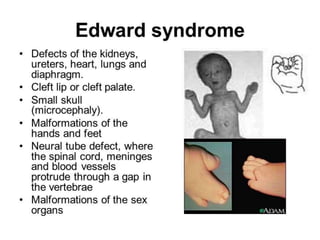This document lists several chromosomal disorders including Turner's syndrome, Down's syndrome, Klienfester's syndrome, Patau's syndrome, Edward's syndrome, Cri-du-chat syndrome, and Fragile X chromosome. It provides the names of some examples of chromosomal disorders.