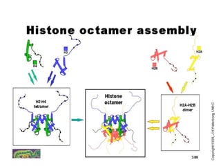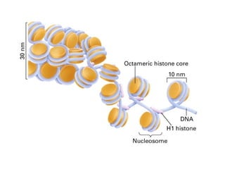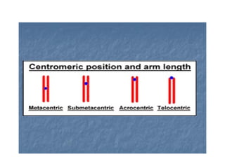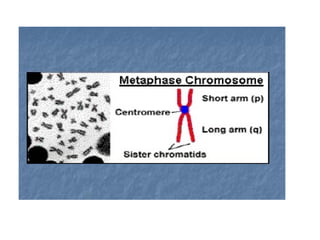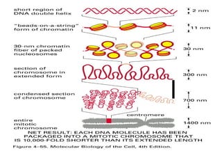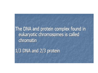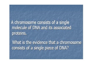 This document discusses chromosome structure and organization. It begins by listing components of chromosomes like centromeres, telomeres, and origins of replication. It then describes how genes are organized between centromeres and telomeres in eukaryotes. Genes can be relatively short with few introns in lower eukaryotes, and longer with many introns in higher eukaryotes. The document also discusses the differences between chromosomes and chromatin, homologous chromosome pairs, autosomes and sex chromosomes, and types of heterochromatin and euchromatin.